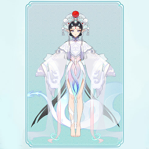 肩部设计参考了粤剧里常见的云肩,让整体设计粤剧风味更鲜明;下半身是白蛇元素的集中体现。运用了蛇形腰带,附带蛇鳞的薄纱裙,以及腿部白蛇纹身,无一不体现素贞的白蛇特征。